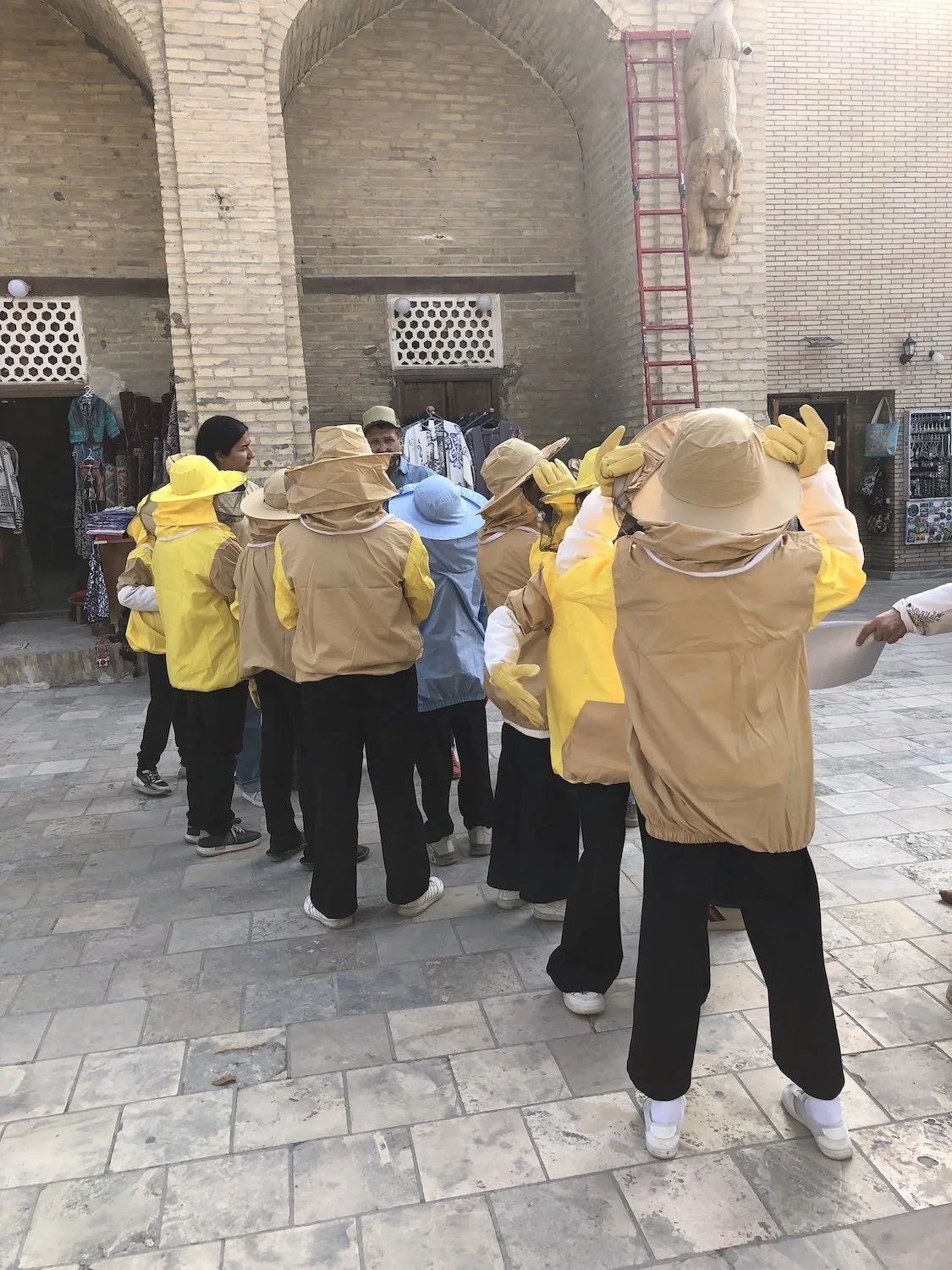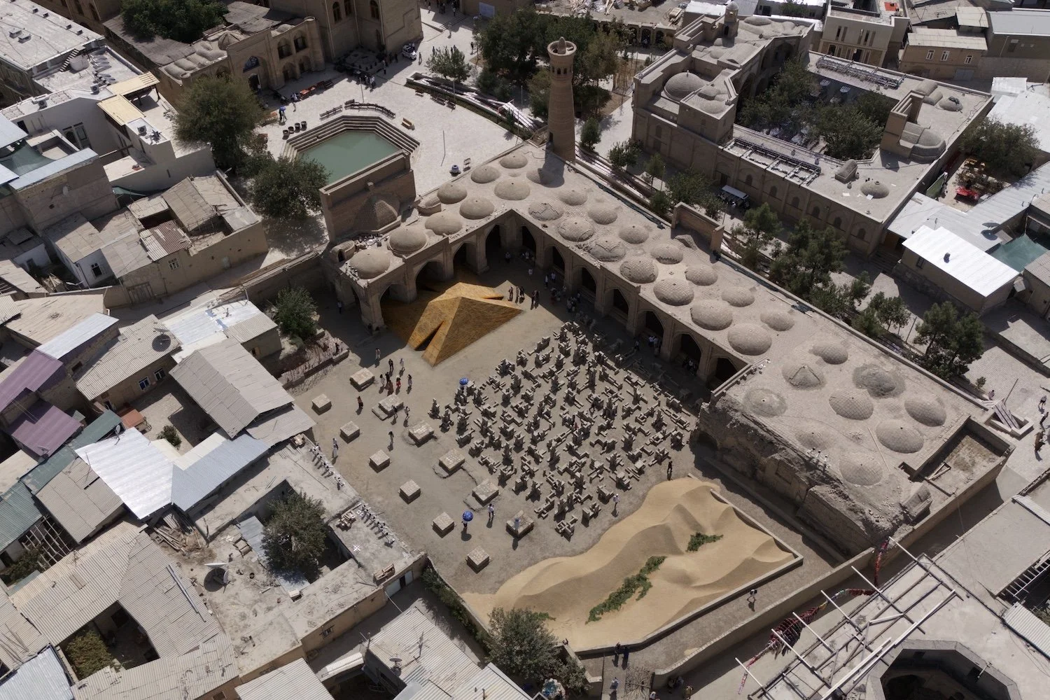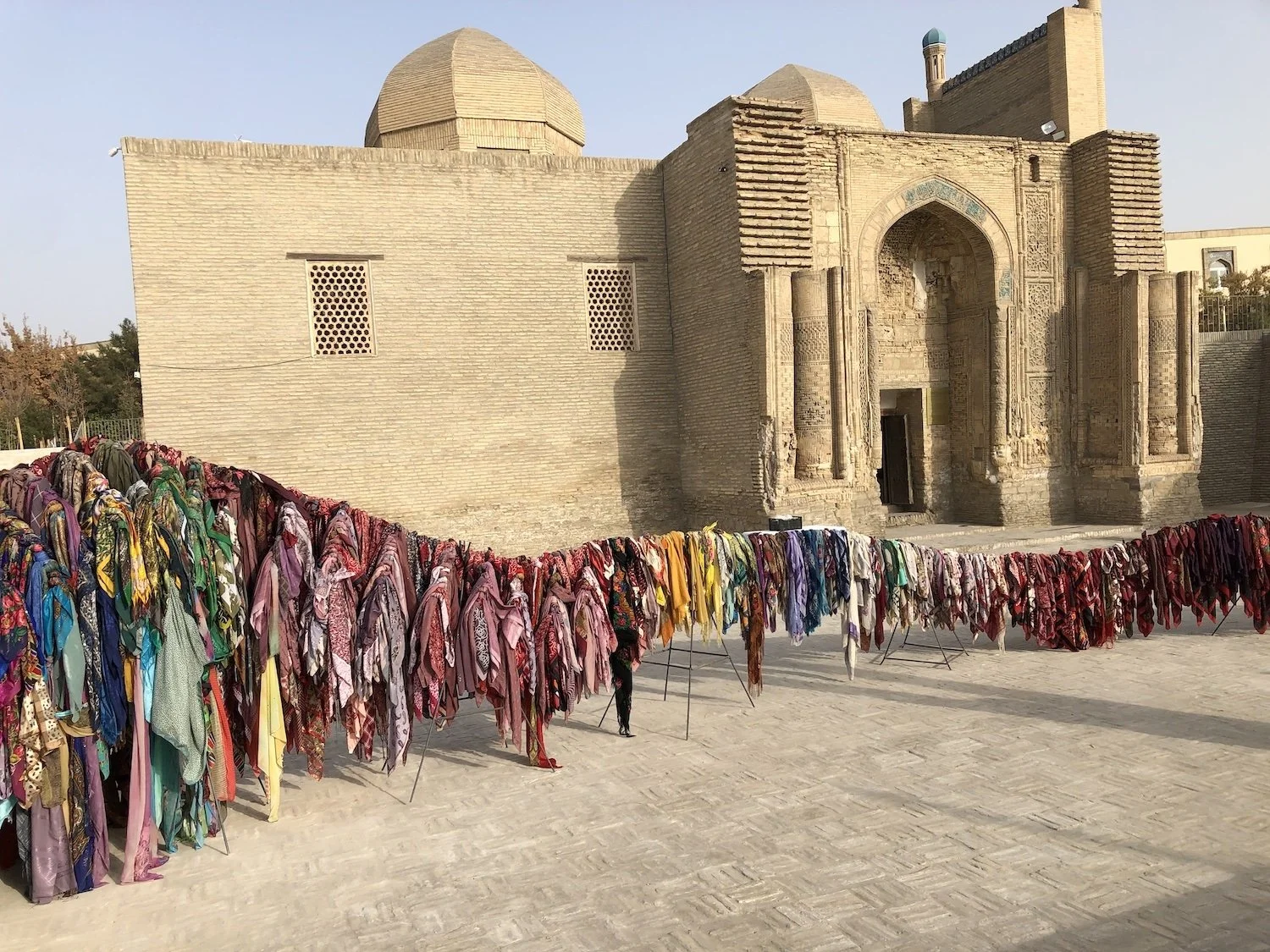 Blickte man von den Sanddünen in die Höhe, befand sich am nächstliegenden Haus ein Drache, der aus unzähligen Kopftüchern gemacht worden war: A Thousand Prayers (2025) bestand aus Kopftüchern, die die Frauen von Buchara Jazgul Madazimova zur Verfügung gestellt hatten. Madazimova, eine kirgisische Künstlerin, die u.a. im Gorki Theater in Berlin gearbeitet hat, beschäftigt sich häufig mit dem Thema Arbeitsmigration von Frauen und der Wechselbeziehung der Bedeutung des Kopftuchs mit der Stellung der Frauen in der Gesellschaft. Ausgangspunkt dafür war die Geschichte ihrer Mutter, die nach dem Zusammenbruch der Sowjetunion die finanzielle Verantwortung für ihre Familie übernahm, nachdem der Vater arbeitslos geworden war. Um in privaten Haushalten in Moskau arbeiten zu können, legte sie, eine traditionell gekleidete muslimische Frau mit Kopftuch, dieses ab und beschloss kurze Haare zu tragen. A Thousand Prayers wurde eines Abends von der Wand abgenommen und in einer Art Parade, als würde der Drache von selbst seinen Platz wechseln wollen, auf den Platz vor der Magoki-Attori-Moschee transferiert und dort aufgestellt, bevor die Arbeit zu einem späteren Zeitpunkt aufgelöst und die Kopftücher wieder den Frauen in Buchara zurückgegeben wurden. Die Magoki-Attori-Moschee ist ursprünglich ein Bau aus dem 9. oder 10. Jahrhundert, womit sie eine der ältesten Moscheen in Zentralasien ist.