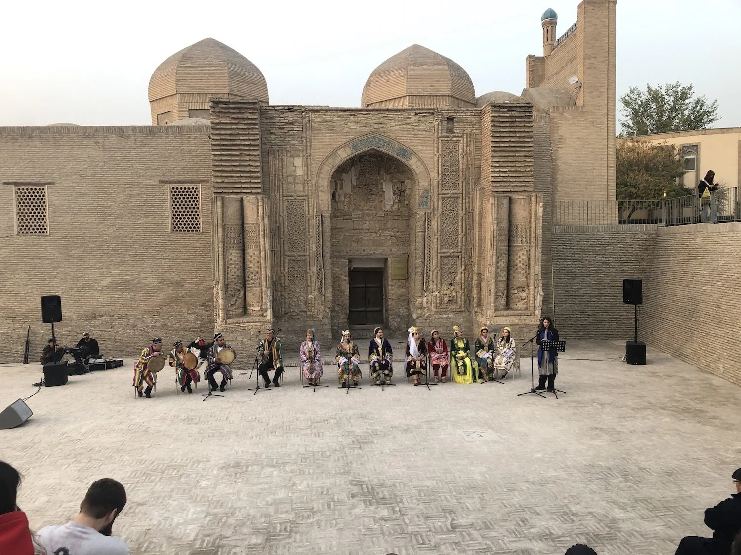 Anna Lublina (stehend rechts), Bukhara Peace Agency, mit Musikern des Philharmonic Orchestra und Sozandas von Buchara am Magoki Attori Square, 17.11.2025