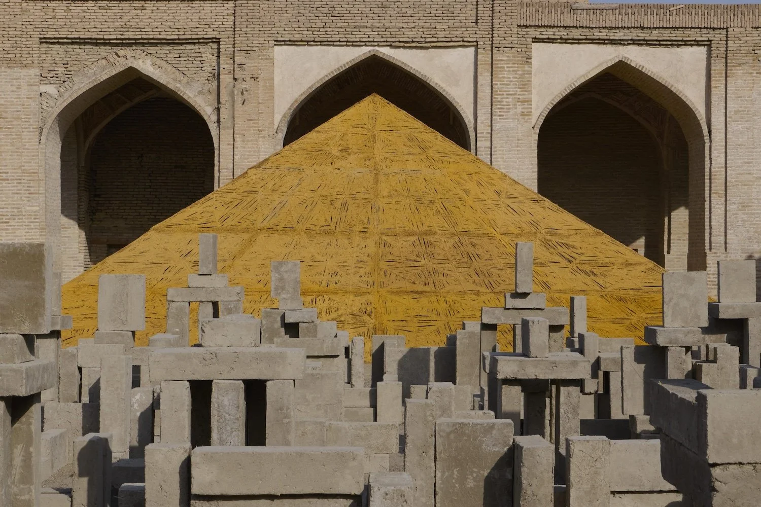 Wollte man in den großen Hof des Khoja Kalon gelangen, hatte man die Möglichkeit durch die Arbeit von Delcy Morelos gemeinsam mit Baxtiyor Akhmedov La Sombra Terrestre (The Earth’s Shadow), 2024–2025, hindurch zu gehen. Es handelte sich dabei um eine pyramidenartige Struktur aus Holz, die mit Jutefäden netzartig von einheimischen Handwerkern bespannt wurde. Die Bildhauerin stellte sich vor, dass sich ihre Arbeit in die alte Architektur des Kholja Kalon hineinwebte. Bestrichen wurde die gesamte Skulptur mit einer Masse aus Erde, Sand, Gewürznelken, Zimt und Kurkuma, dessen Rezept von Gewürzhändler:innen in vierter Generation aus Buchara erfunden und hergestellt wurde. Diese Skulptur faszinierte nicht nur durch ihren geheimnisvollen Lichteinfall im Inneren, sondern auch durch den angenehmen Duft, den sie verströmte.
